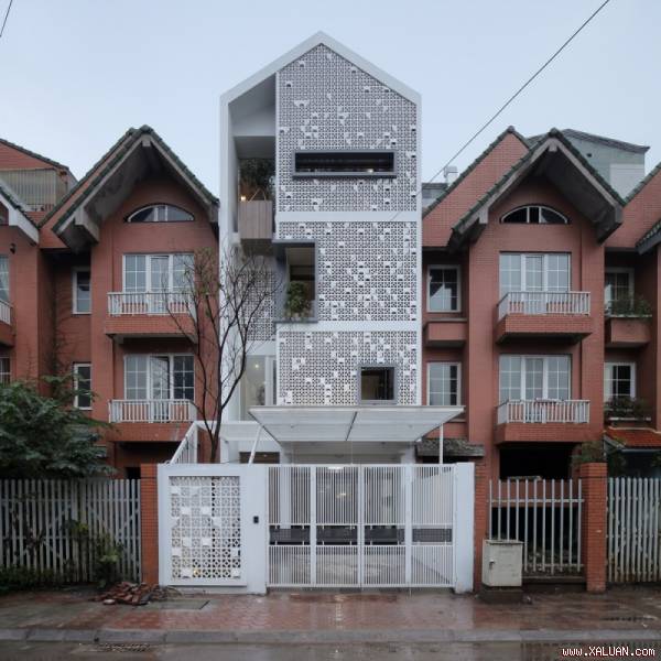 Bên ngoài ngôi nhà được bao quanh bởi một lớp gạch thông lỗ sơn trắng.